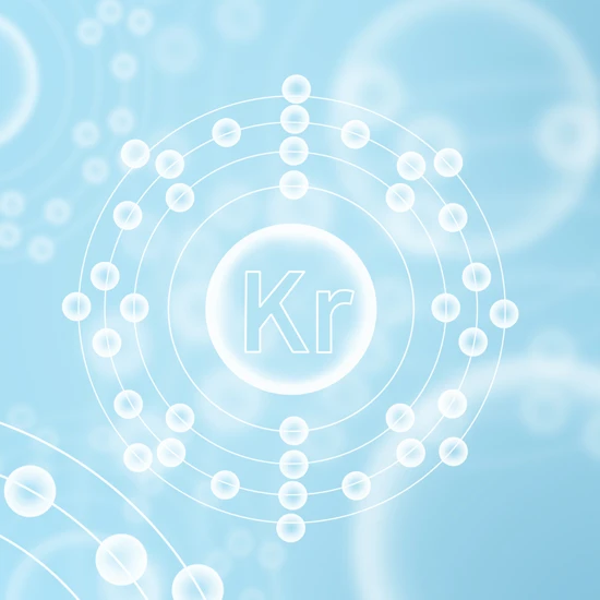 Krypton (Kr, from Greek “kryptos” – hidden, concealed) is the fourth of the rare gases, neither flammable nor toxic, and forms a coloress, odorless, monoatomic and chemically inert gas. The density of Krypton amounts to 3.506 kg/m3 at 15 °C / 1000 mbar, while the Krypton gas molar mass equals 83.8 g/mol. It is only found in the atmosphere in traces of 1.14 ppm (1.14 parts per million, roughly 1 out of one million particles) and thus constitutes only a narrow fraction of the air on Earth.